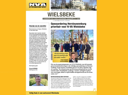 Deze week werd het eerste nummer van 2018 van het huis-aan-huisblad van N-VA Wielsbeke bedeeld in Ooigem, Sint-Baafs-Vijve en Wielsbeke. Eén van de verkiezingspijlers van ons verkiezingsprogramma, namelijk de opwaardering van Hernieuwenburg wordt erin toegelicht door Frank Soetaert, kandidaat op de N-VA-lijst in oktober. Maak in dit blad ook kennis met andere nieuwe namen op onze lijst met name Wout Verheye en Aurélie Declerck uit Ooigem, Jan Decouttere uit Wielsbeke en Piet Vroman en Lies Therssen uit Sint-Baafs-Vijve.